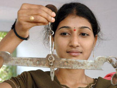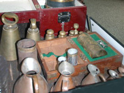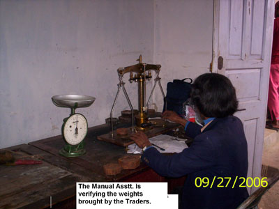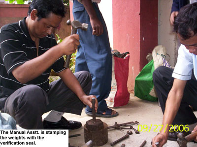 The Inspector of Weights and Measures is verifying the weights brought by the Traders